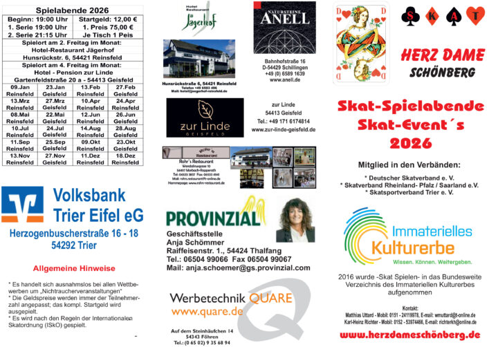 2. März 2025 Thomas Hargarten gewinnt den 18. Hunsrücker Skatmarathon Beim 18. Hunsrücker Skatmarathon in Rapperath triumphierte Thomas Hargarten von den Skatfreunden "Herz Bube Bitburg". mehr